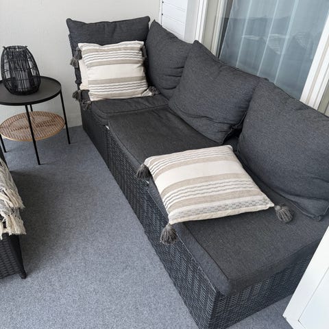 Sohvassa on mustat rungon osat ja irrotettavat harmaat istuin- ja selkätyynyt. Sopii parvekkeelle tai terassille. Hyvässä kunnossa. Pehmusteiden mahdolllinen pesu jää ostajalle. Ei isompia tahroja näkyvillä. Runko tulee kolmessa osassa, joten mahdollisuus käyttää myös erikseen tai laittaa mukana tulevilla klipsuilla kiinni toisiinsa.