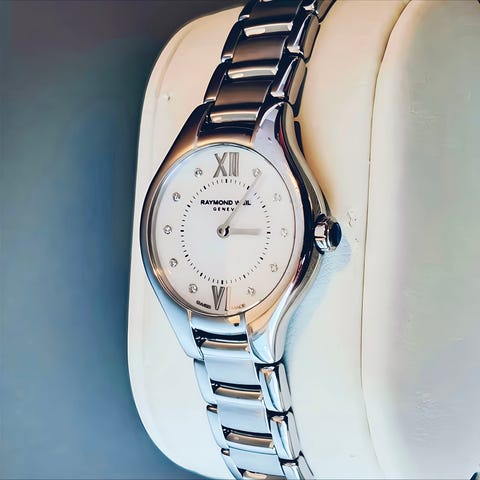Eterna naisten rannekello. Kellossa on pyöreä hopeansävyinen kellotaulu ja sininen kehys, jossa minuuttimerkinnät. Taulussa on analoginen näyttö tunti-, minuutti- ja sekuntiosoittimella sekä päivämääränäyttö. Rungon materiaali on metallia. Ranneke on valkoinen nahkaranneke perinteisellä solkikiinnityksellä. Kello sopii naisille jokapäiväiseen käyttöön.