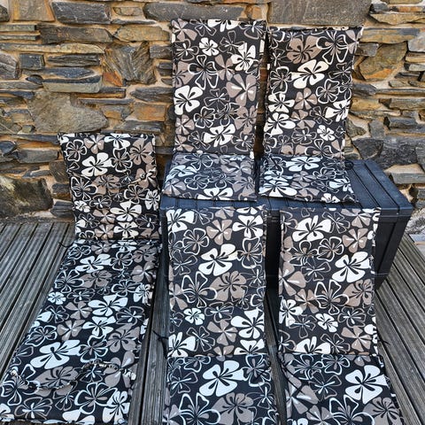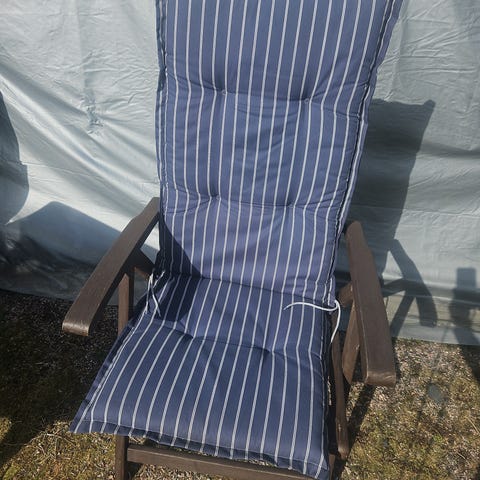 Harmaa tuolin istuin- ja selkätyyny ulkokäyttöön. Tyynyssä on paksu pehmuste sekä korkea selkänoja, joka tuo tukea istumiseen. Takapuolella on kantokahva tai remmi, jonka avulla tyynyä on helpompi siirtää ja kiinnittää tuoliin. Sopii esimerkiksi puutarha- tai terassituoliin lisämukavuutta tuomaan. Neljä kappaletta/8€ kpl