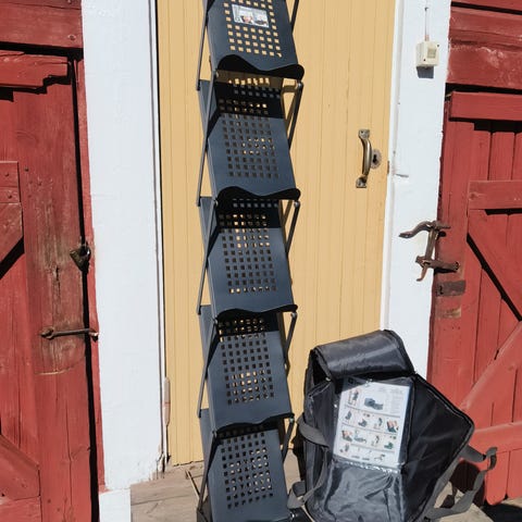 Kuvan mukainen uusi teline. Ollut pihalla, joten kuvassa näkyy hieman likaa. Lähtee kuitenkin pyyhkimällä pois.
