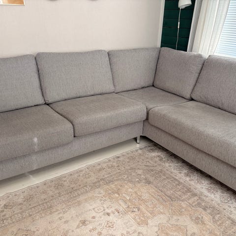 Ehjä kulmasohva, josta saa vuoteen. Säilytyslaatikolla. Käytön jälkiä ja pesun tarpeessa, mutta täysin ehjä sohva. Eläintalous.