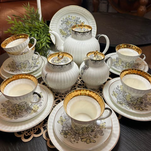 • 6 kuppia • 6 aluslautasta • 6 jälkiruokalautasta • 1 syvä lautanen, kahvipannu • kermakko • sokerikko