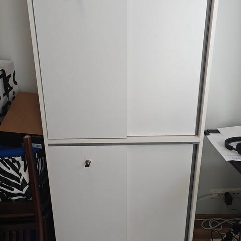 Tv käytössä ollut vanha kirjakaappi. Kokopuinen. Ovet niin painavat ettei pysy pystyssä ilman seinäkiinnitystä, siksi takalevyssä (vaneria) reikiä. Hyllyissä johdoille reikiä. Maali jo parhaat päivänsä nähnyt. Vain haku.