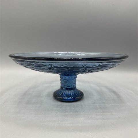 Sininen paksulasinen jalallinen tarjoiluvati, jossa on koristeellinen kuviointi.Vati on hyvässä kunnossa ilman näkyviä vaurioita.