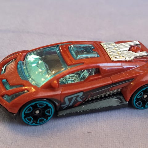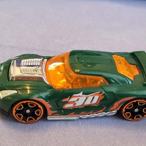 Leikitty pikkuauto. Lähitarkastelussa käytön jälkiä. Ehjä.