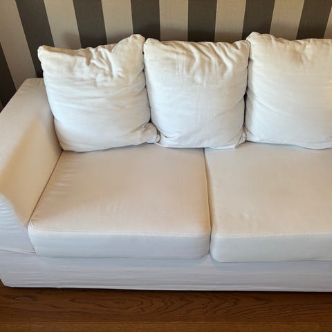 Vaalea kangasverhoiltu 3 hengen Askosta alkujaan hankittu sohva. Sohvassa on kaksi istuintyynyä ja pehmeät selkätyynyt. Käsinojat ovat pyöristetyt ja verhoilu on vaaleaa kangasta. Kaikissa tyynyissä irrotettavat ja pestävät verhoilut, 40 asteen hienopesu. Yhdessä istuintyynyssä verhoilussa on kulumaa tai repeämää, kuten kuvasta näkyy. Jää piiloon, eikä ole haitannut käyttöä. Sopii olohuoneeseen tai muuhun oleskelutilaan istuin- ja lepotilaksi.