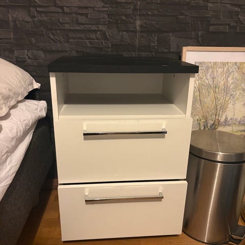 Jysk yöpöytä, jossa kaksi vetolaatikkoa. Pöydän verhoilu on mustaa keinonahkaa ja laatikoissa on metalliset vetimet. Sopii yöpöydäksi tai pieneksi säilytyskalusteeksi esimerkiksi makuuhuoneeseen tai olohuoneeseen. Ilman tahroja, käytönjälkijä. Molemmat hintaan. Saa neuvotella.