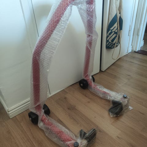 Teline on tarkoitettu moottoripyörän takapään nostamiseen huoltoa, renkaiden vaihtoa tai säilytystä varten. Rullat helpottavat pyörän liikuttelua telineen varassa. Runko on metallinen ja maalattu punaiseksi. Soveltuu käytettäväksi tasaisella ja kovalla alustalla.