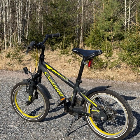 Crescent lastenpyörä 16" renkailla. Pyörässä on jalkajarru takana ja käsijarru edessä joka vähän jumittaa. Varusteluun kuuluu etukori jossa pari lommoa ja reikää sekä tavarateline takana. Runko on matala, mikä helpottaa kyytiin nousemista. Ruostetta siellä täällä ja naarmuja. Satulassa pieni reikä edessä. Apurenkaat mukaan. Renkaat pumpattu täyteen mutta en tiedä pitääkö ilmaa. Huollon kautta käyttöön.
