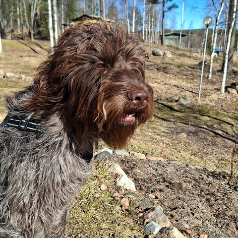 Puinen koirankoppi, jossa pieni katettu terassi edessä. Seinät ovat pystypaneloituja ja maalattu harmaiksi, listat ja kulmat valkoisia. Kopissa on pyöreä ikkuna sekä kaarevaksi muotoiltu kulkuaukko. Katto on loiva ja päällystetty kattohuovalla. Sopii koiralle suojaisaksi ulkomajaksi pihalle tai tarhaan.