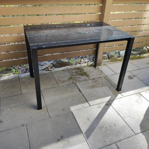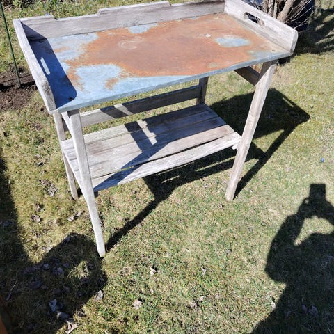 Annetaan ruskea puutarhapöytä ulkokäyttöön. Pöydän kansi on säleikkömallinen ja suorakaiteen muotoinen. Keskellä kantta on reikä aurinkovarjolle. Pöydässä on tukijalka poikittaispalkilla, joka lisää rakenteen tukevuutta. Sopii esimerkiksi terassille tai pihalle ruokailu- ja oleskelupöydäksi. Kaipaa hiontaa ja ja pensseliä.