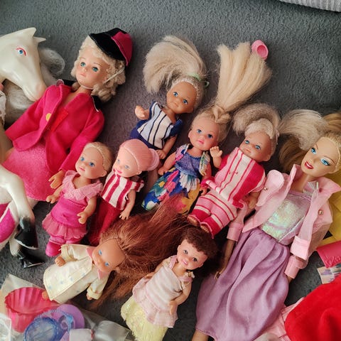 Kuvien mukainen setti. Sisältää Barbiet ja pienemmät nuket, hevoset, vaatteet, korut, kengät, skootteri + kypärä, huonekalut.