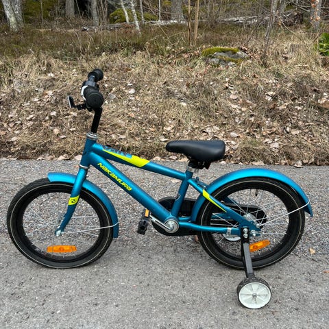 3/25 ostettu hyväkuntoinen lastenpyörä apupyörillä. Normaalia käytönjälkiä jonkun verran, auringon haalistama pehmuste edessä.