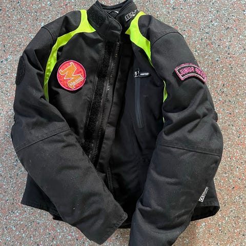 Lasten ajopuku, johon kuuluu takki ja housut. Koko 150 cm