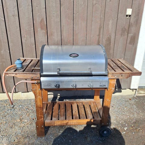 Suoraan käytöstä kaasugrilli, jossa kolme pääpoltinta ja erillinen sivukeitin. Ritiläosa ja rasvapelti ruostunut puhki. Muutoin käyttökunnossa.