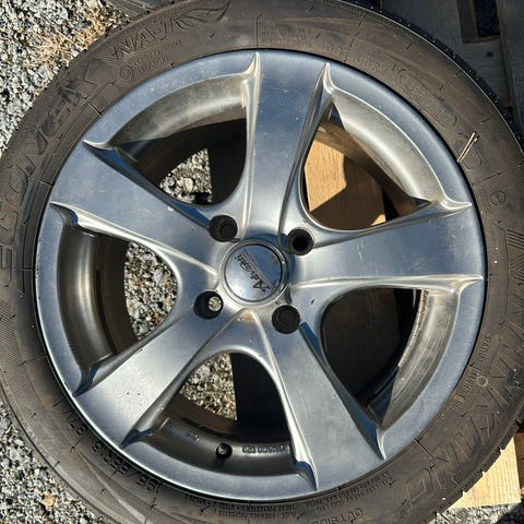 Kehnot, mutta vielä laillisella pinnalla olevat ja ehjät kesärenkaat vanteilla. Olleet Qashqai alla. Tulivat auton mukana, mutta tuohon on kolmet vanteet niin en ole edes kokeillut alle. Vaikuttavat kuitenkin suorilta. Myydään siinä kunnossa kuten ovat, joten saattavat vaatia tasapainotuksen.
