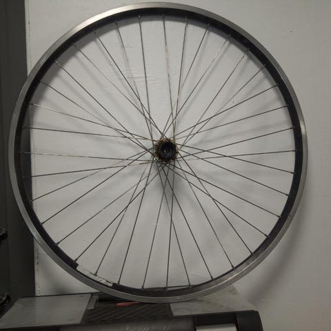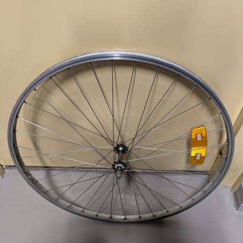 Polkupyörän etukiekko 29”. Metallivanne, pinnoitettu teräspinnoilla. Väri, valkonen (kerma) ja punainen raita.