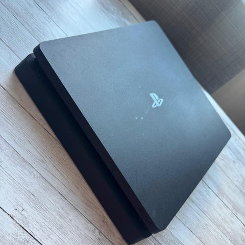 PS4 slim pelikonsoli musta kahdella ohjaimella ja peleillä