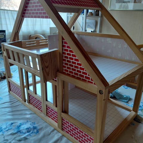 Puinen nukkekoti kalusteineen. Avautuu edestä. Nukkekoti on alunperin ollut kokonaan vaaleanpunainen, maalattu sisältä osittain valkoiseksi.