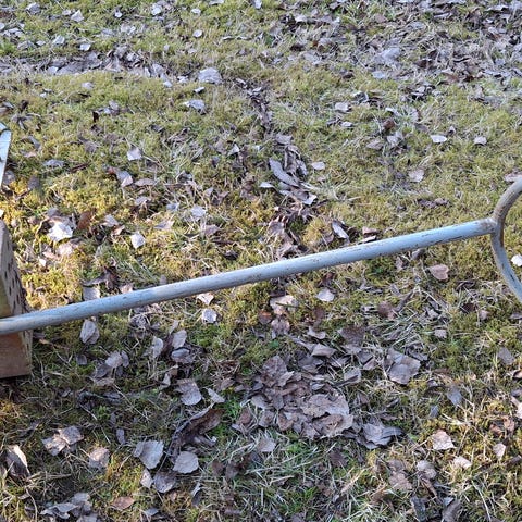 Vanha metallinen käsiaura. Työvälineessä on kaksi pitkää ohjausvartta ja keskellä kiinteä aurateri maaperän muokkaamiseen. Sopii esimerkiksi pihan tai pellon perinteiseen käsin tehtävään muokkaukseen tai koriste-esineeksi pihapiiriin. Rakenne on yksinkertainen ja valmistettu pääosin metallista.