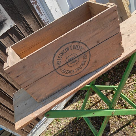 Guldborghave puinen laatikko. Materiaalina käsittelemätön puu, laatikossa painatus “GULDBORGHAVE DANMARK”. Sopii esimerkiksi säilytykseen, sisustukseen tai puutarhakäyttöön. Laatikkorakenne on naulattu ja avoin ylhäältä, sivuissa tukevat päädyt.en postita mmm