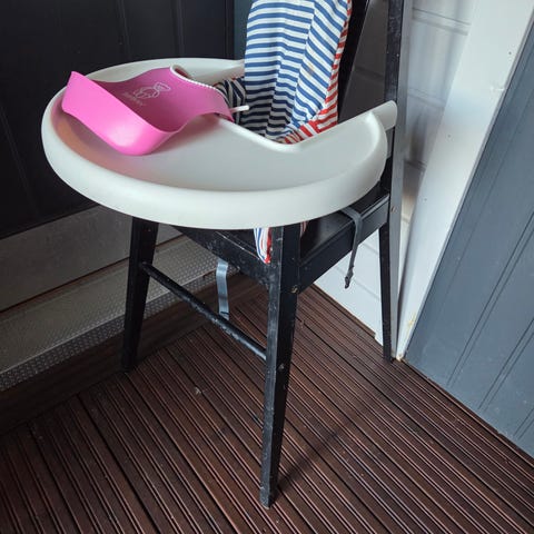Syöttötuoli, etupuolelle voi pienimpiä varten asentaa lisätuen.