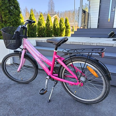 Lastenpyörä 20" renkailla. Pyörässä on sininen runko, mustat renkaat ja lokasuojat sekä valkoinen etuhaarukka. Varustettu jalkatuella ja ketjusuojalla. Soveltuu lapselle, jolle 20" kokoinen pyörä on sopiva.