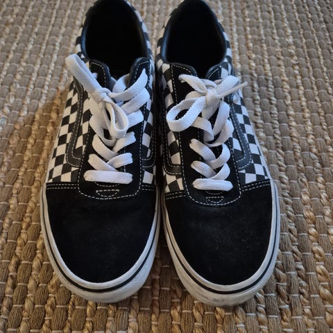 Myydään käytetyt Vans Old Skool -tennarit. Klassinen musta/valkoinen väritys, mokkanahkapäällinen. Koko EU 37 (US Youth 5.5, UK 4.5, 23.5 cm). Kengät ovat käytetyt – pohja ja kärki kuluneen näköisiä – mutta toimivassa kunnossa. Sopivat esim. kouluarjen kengiksi.