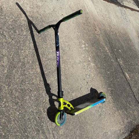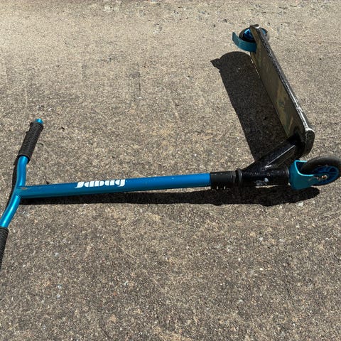 Musta temppupotkulauta. Soveltuu skeittiparkkeihin ja kaupunkiajoon. Yksi etu- ja yksi takapyörä, T-mallinen ohjaustanko ja jalkajarru takapyörän päällä. Runko ja dekki ovat metallia, käsikahvat kumia. Potkulauta on suunniteltu yhdelle käyttäjälle kerrallaan.