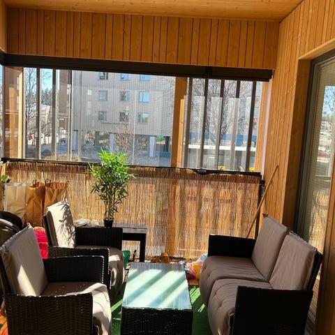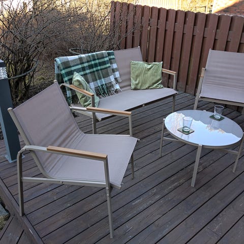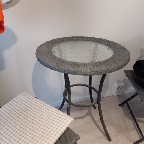 Kuuluu 2 kpl tuoleja, yksi sohva ja lasinen sohvapöytä.