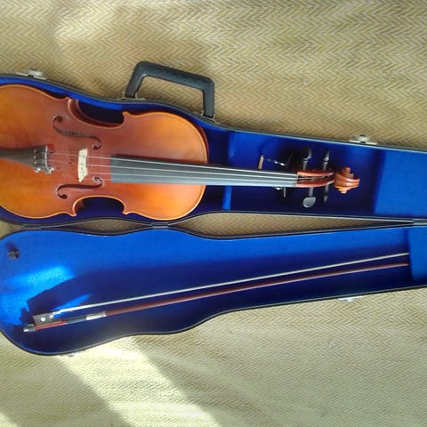 Kuvan mukainen lasten viulu. Ollut runsaassa käytössä, mutta hyväkuntoinen vielä. Joitakin käytön jälkiä näkyy.