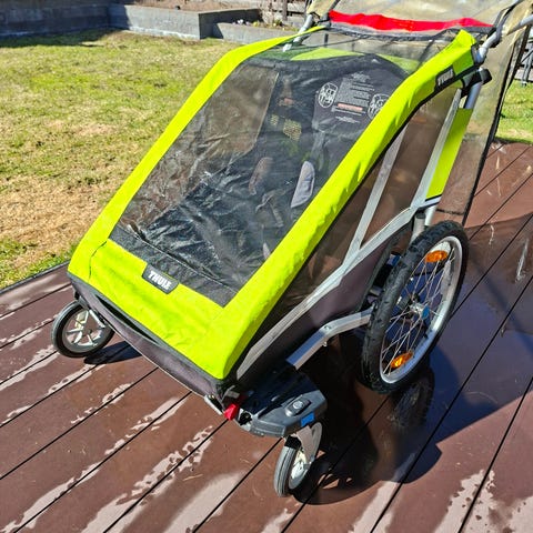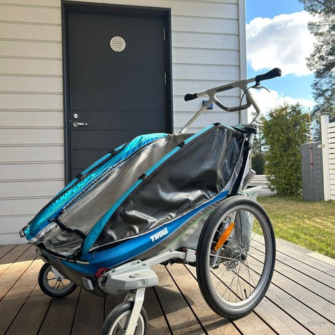 Thulen kaksipaikkainen pyöräkärry, voidaan käyttää myös rattaina. Kankaat ehjät, mutta jo hieman kuluneet, kankaat juuri pestyt. Hyttysverkossa muutaman sentin kokoinen reikä alaosassa (kuva). Autokatoksessa säilytetyt. Toimiva peli seuraavalle.