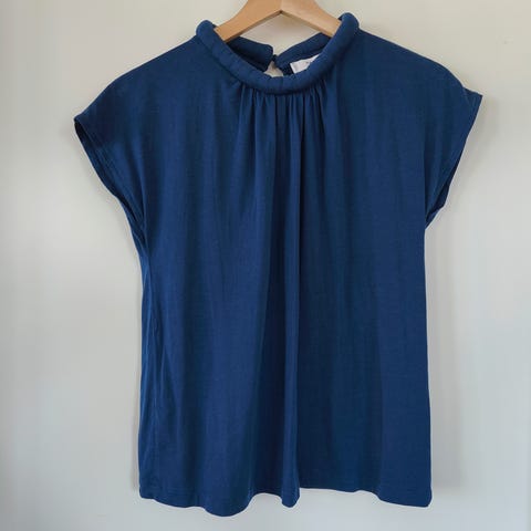Mango naisten mekko koossa S. Sininen, valkoraidallinen malli, jossa kaulus ja pitkät hihat. Materiaali on puuvillaa. Edessä kietaisumainen leikkaus ja napitus. Soveltuu arki- ja toimistokäyttöön esimerkiksi housujen tai hameen kanssa.