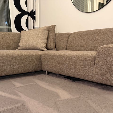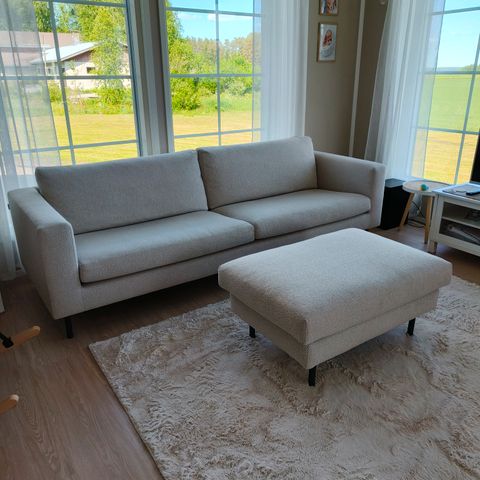 Vaalea avokulmasohva, värissä hiekka ja tammijaloilla. Loistavassa kunnossa, ei käytönjälkiä.