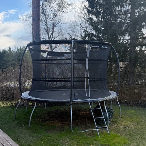 Trampoliini on hyvässä kunnossa ja täysin käyttövalmis. Runko tukeva, hyppymatto ehjä ja turvaverkko kunnossa.
