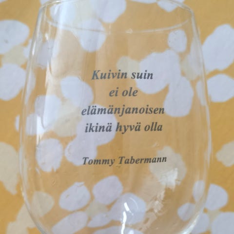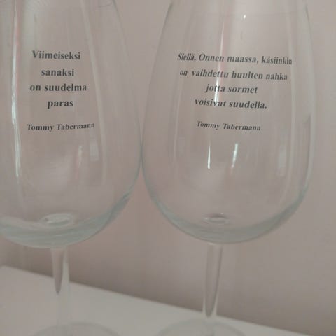 Läpinäkyvästä lasista valmistetut jalalliset viinilasit, joissa on painettuna Tommy Tabermannin runotekstejä. Sopivat viinin ja muiden juomien tarjoiluun kattauksissa sekä arkeen että juhlaan.
