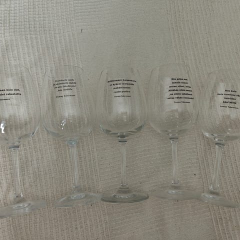 Hyväkuntoiset, täysin ehjät viinilasit runotekstillä 6 kpl. Jokaisessa eri runo.