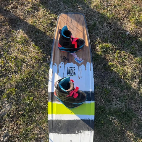 Myydään Obrien wakeboard lauta ja siteet. Pituus 140cm, leveys 42,9cm, siteet 38-42.