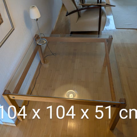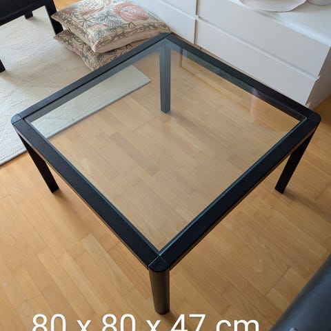 Puinen sohvapöytä lasitasolla. Pöytä on erittäi. Hyvässä kunnossa. Lasissa ei naarmuja. Vain nouto hissillisen kerrostalon kolmannesta kerroksesta. Korkeus 49 cm, leveys 75 cm ja pituus 128 cm.