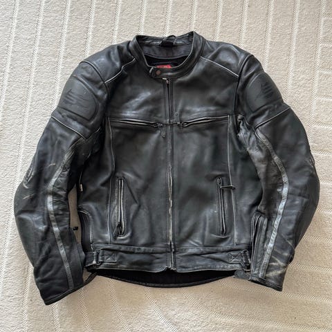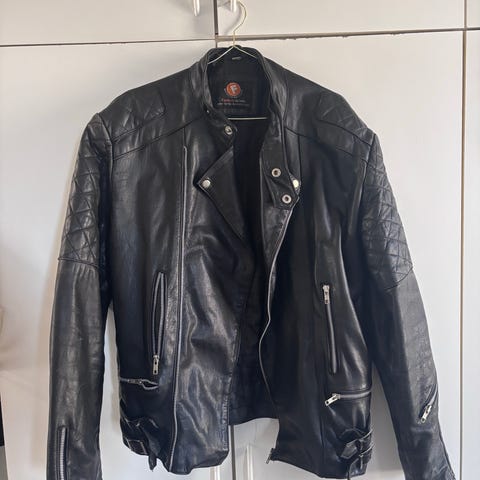 Segura musta nahkainen ajotakki. Alhaalle teetetty vetoketju housujen kiinnitystä varten.