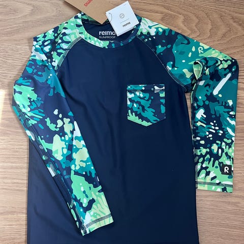 Uutena ostettu, yhdellä tytöllä yhden kesän käytössä ollut laadukas Reiman setti, johon kuuluu UV-uimapaita "Joonia" sekä uimashortsit "Nauru Akva". Molemmissa vaatteissa UV-suojakerroin 50+, shortsien koko 128, paidan koko 122. Todella hyvä kunto. Shortseissa hauska taikakuvio! Kuvio ilmestyy, kun kangas kastuu :)