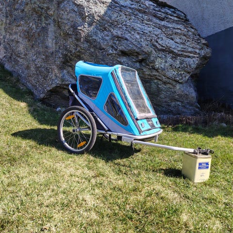 Polkupuörän peräkärry vihreä-mustalla kangasrungolla. Kärry toimii myös juoksukärrynä. Sisällä on istuin kahdelle pienelle lapselle sekä turvavyöt. Sivuseinissä ja etuosassa on ikkunat, joissa hyttysverkko ja sadesuoja. Takana on tavaratilaa pientä kuormaa varten. Peräkärry kiinnitetään polkupyörään vetoaisalla ja kiinnityspalalla, jotka sisältyvät kokonaisuuteen. Painoraja 40kg. Pieniä kuluman jälkiä ja reikä verkossa.