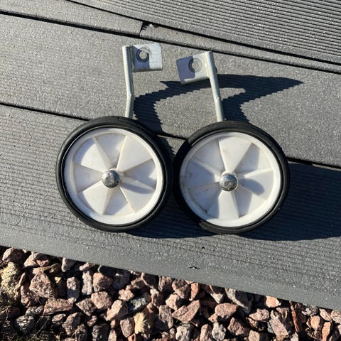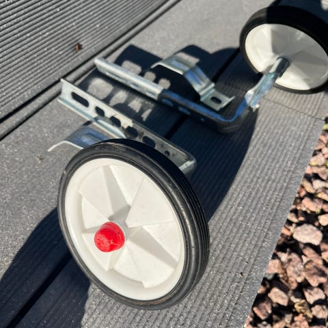 Kaksi paria apupyöriä lasten pyöriin. Isompien apupyörien halkaisija on 13 cm ja pienempien halkaisija on 10 cm. Kuvassa näkyvät tarvikkeet tulee paketissa.