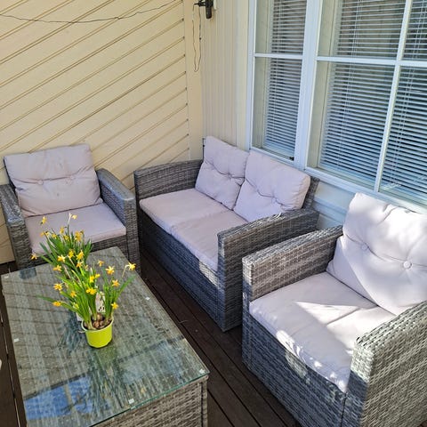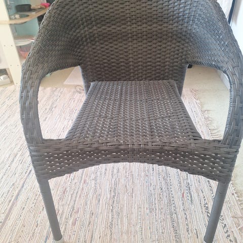 Polyrottinki ulkotuoli terassille tai parvekkeelle. Tuolissa on matala, leveä istuin ja selkänoja. Materiaali on tummanharmaata/mustaa polyrottinkia metallirungolla.