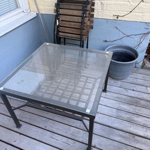 Terassikalustesetti pöydällä ja kahdella tuolilla musta metalli
