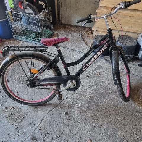 Lasten polkupyörä 24" renkailla. Runkomalli on matala, mikä helpottaa kyytiin nousemista. Pyörässä on turkoosi runko, musta satula ja musta ohjaustanko. Takana on tavarateline ja lokasuojat edessä ja takana. Soveltuu noin 24"-kokoista pyörää käyttävälle lapselle tai nuorelle arkiajoon ja koulumatkoille.