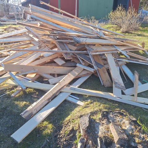 Kuvan mukaista puutavaraa. Ollut taapelissa ainakin 10 v. Pääasiassa haapalautaa, myös havulautaa. Kasan mitat silmävaraisesti n. 1m*4,5m*0,7m. Innokkaampi tekisi noista vielä lauteet, taapeloitu tavara tuntuu kohtalaisen kovalta. Kaikki on vietävä kerralla. Autolla pääsee metrin päähän. Vaihtuu Fazerin siniseen suklaalevyyn.