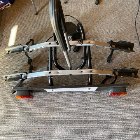 Kahdelle pyörälle taittuva teline, takaluukun voi avata irrottamatta telinettä