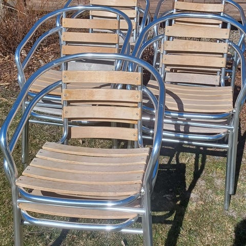 Metallirunkoiset polyrottinkituolit. Tuoleissa on keltaruskea rottinkipunos istuimessa ja selkänojassa sekä musta metallirunko kaarevilla käsinojilla joissa teakkiset käsinojat. Sopivat esimerkiksi terassille tai parvekkeelle. Pyynti yht 2 kpl 40€ kulkeutuu Lahteen omien menojen mukana.
