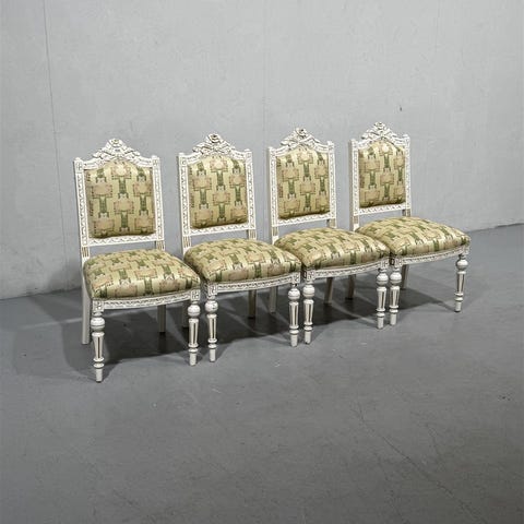 Neljä kustavilais-tyylistä tuolia, joissa on koristeelliset selkänojat ja jalat. Tuolit on verhoiltu kukkakuvioisella kankaalla, jossa on vihreitä ja vaaleanpunaisia sävyjä. Siistissä kunnossa, pinnat entisöity jossain vaiheessa. 1900 luvun alkupuolta.Tuolit ovat hyvässä kunnossa, mutta niissä on havaittavissa pieniä kulumajälkiä._____________________________________Nyt uniikki mahdollisuus hankkia pala televisiohistoriaa kotiin! Tämä tavara on osa YLE rekvisiittavaraston myyntierää.Suomalainen televisiotuotanto ja Yleisradio elävät mukana ajassa ja tämä vaatii kuratointia myös YLEn ainutlaatuisen kattavissa rekvisiittakokoelmissa. Osana jatkuvaa uudistumista tehdään esinepaljoudesta ajoittain myös poistoja.Nyt sinulla onkin mahdollisuus ostaa omaksesi pala suomalaista televisiohistoriaa Ylen kokoelmista poistettujen esineiden ja huonekalujen muodossa.
